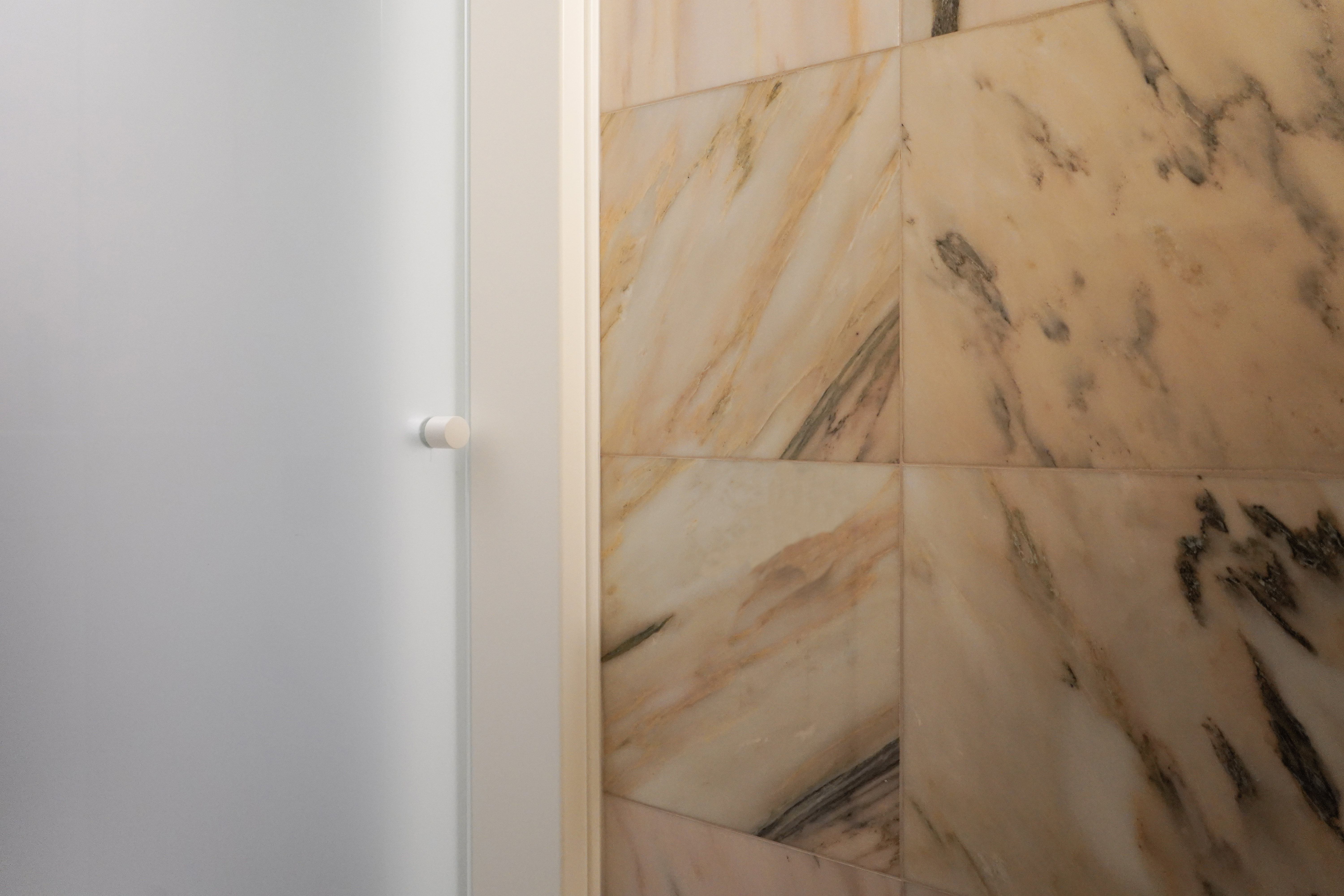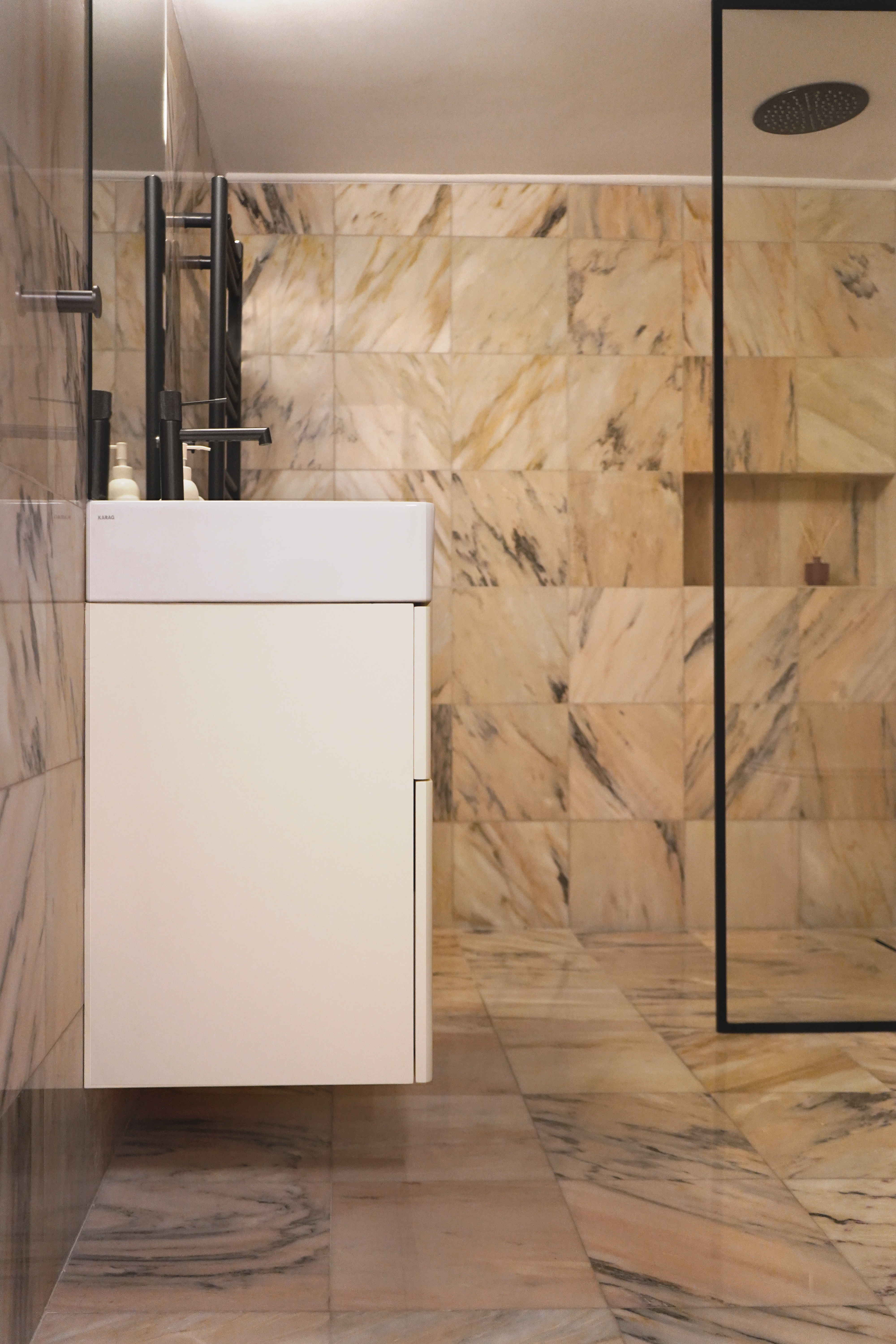 Finally for the bathroom, reclaimed marble tiles were used in continuity with the use of marble in the rest of the apartment. The surrounding of all surfaces with its pink color in combination with the black metal sanitary accessories, generates a luxurious vibe.