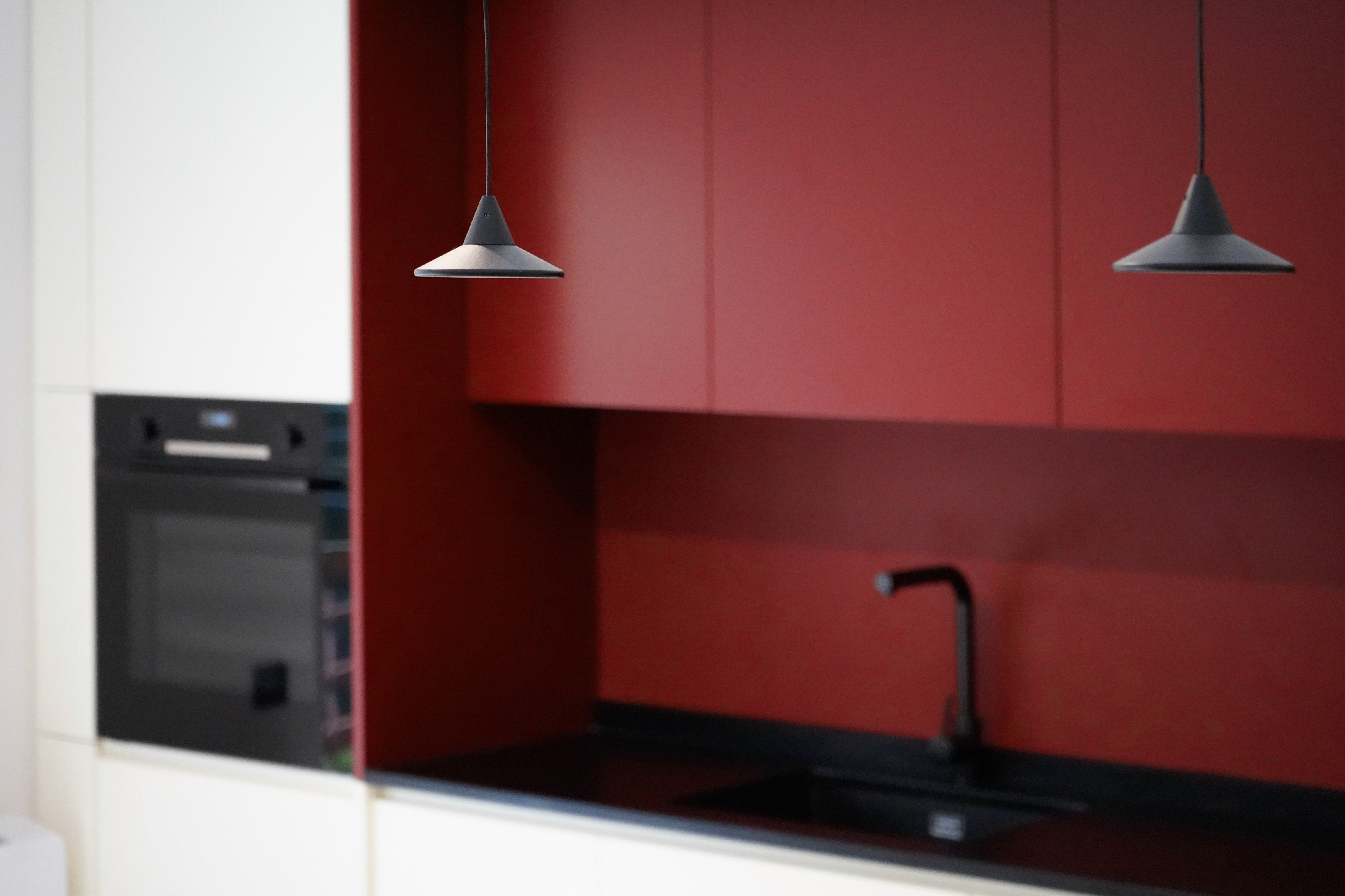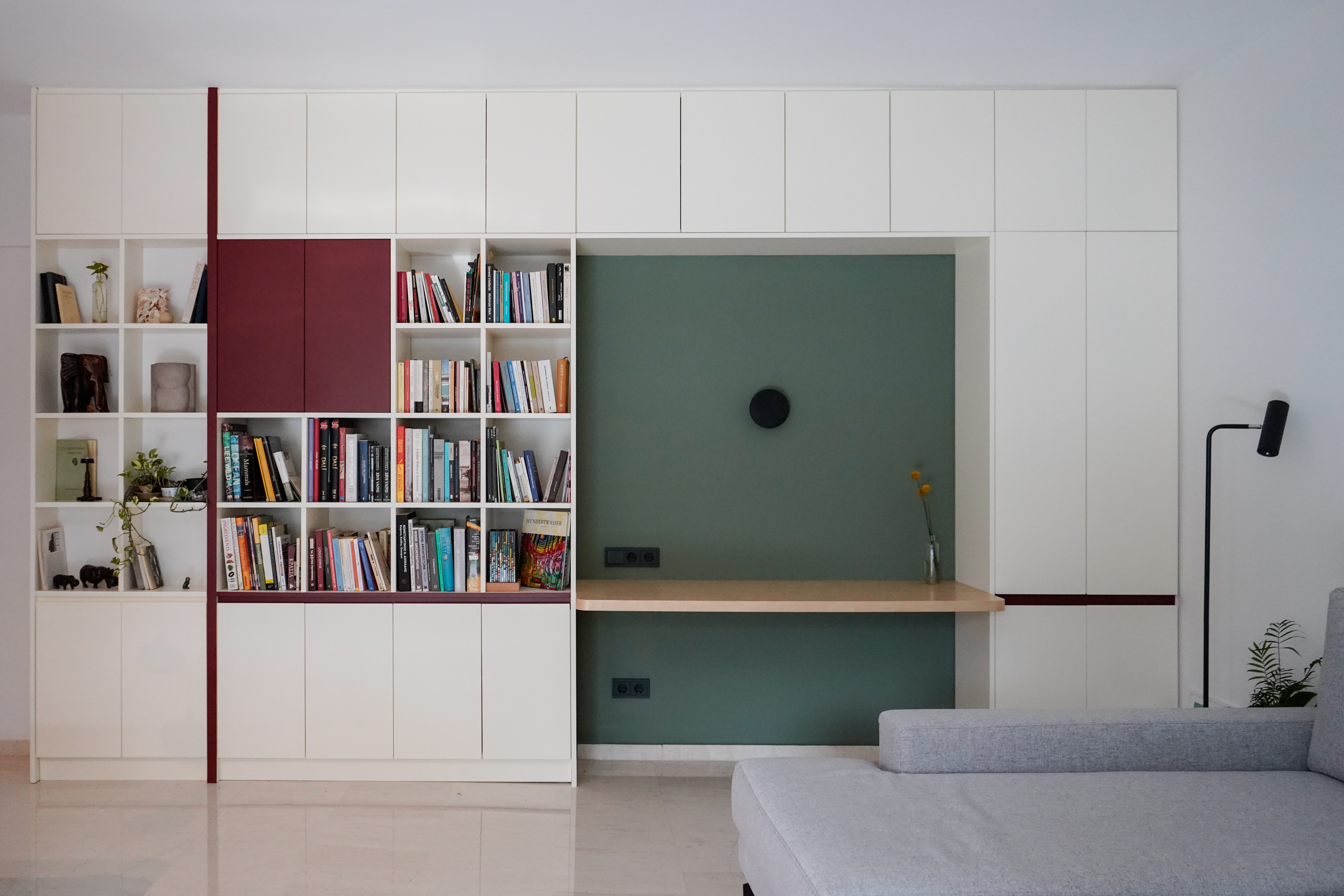 The main move was to demolish the wall dividing the kitchen and the living room of the original layout. Custom furniture was designed around the perimeter of the newly generated room and integrated into the walls visually, using a similar color tone. Different hues were chosen for the functions of the kitchen (deep red) and office (smoked green). Finally, the kitchen island, a "black stone"coupled by a birch wood table, operates as a new soft divider to the living room but at the same time as a unifier, a meeting place for different uses (office, dining, meal preparation, gathering)