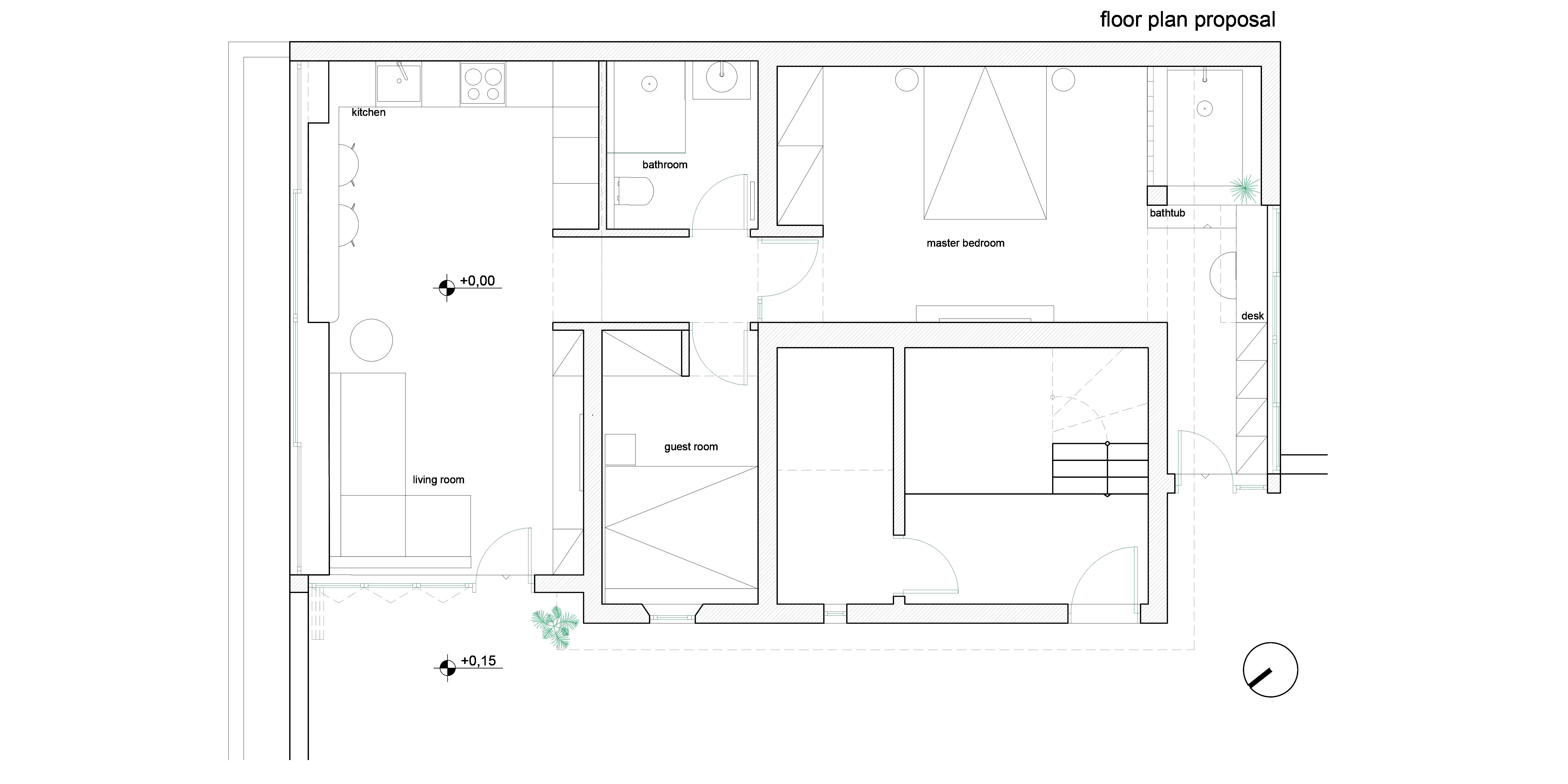 The study proposes the demolition of a wall inbetween the wardrobes of the two independent sections, and the creation of a passage. The suggested apartment layout is divided into 3 zones, the first zone with the large openings hosts the living room and the kitchen area. In the second intermediate zone the bathroom and the guestroom are placed in a way that keeps the small opening towards the terrace. Finally, in the third zone with openings to the south, the master bedroom is located together with an office-desk and low storage cupboards. In addition a built-in bathtub is created, separated from the rest of the room through transparent glass bricks.